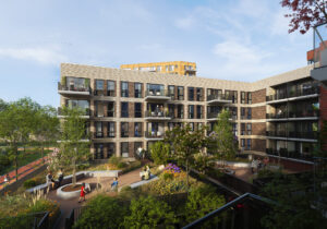 De gebouwen omsluiten twee groene binnenhoven met gezamenlijke leefdekken. Dit zijn fijne plekken voor bewoners om te ontspannen, elkaar te ontmoeten of te genieten van de zon. De appartementen liggen rondom deze hoven en beschikken vaak over royale balkons met uitzicht op het groen.